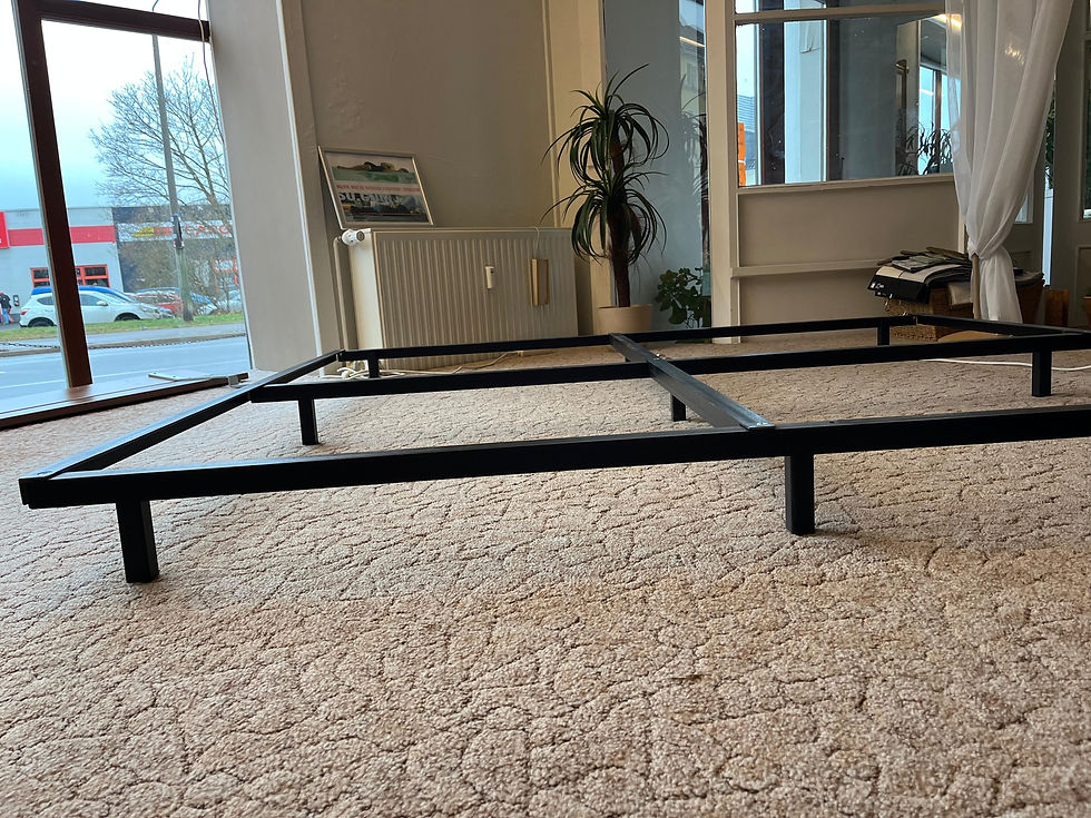 Aktuell steht das Bett auf einem Stahlträgerpodest mit Stauraum, das auf Wunsch ausgetauscht oder angepasst werden kann.